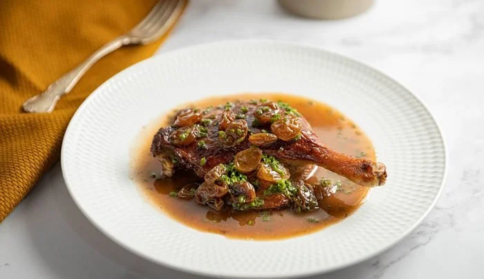 Add port, brandy and raisins to the pan bring to a boil, turn down to simmer and reduce by ¾. Remove from the heat, add butter and stir to melt through the sauce. Add chives and pour the sauce over the duck.