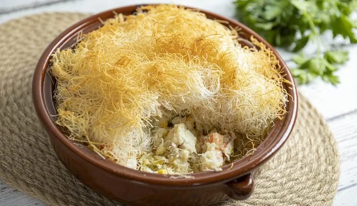 Pour the pot contents into a deep oven dish. Tease the kataifi pastry to loosen. Place in a bowl, season with salt and pepper and coat with a few tablespoons of olive oil.