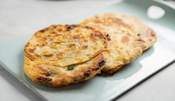 Dust clean work surface with flour. Divide the dough into 4 portions. Use a rolling pin to spread the dough out, roll it as thin as possible. Sprinkle a heaped tablespoon of the chicken mixture and caramelised onion over the dough. Roll up, enclosing all of the filling, then roll to create a snail shape. Gently flatten to make a disk. Cook in a hot pan with a drizzle of extra virgin olive oil, over medium heat for 3-4 minutes on each side or until golden brown. Repeat until all of the dough has been used.