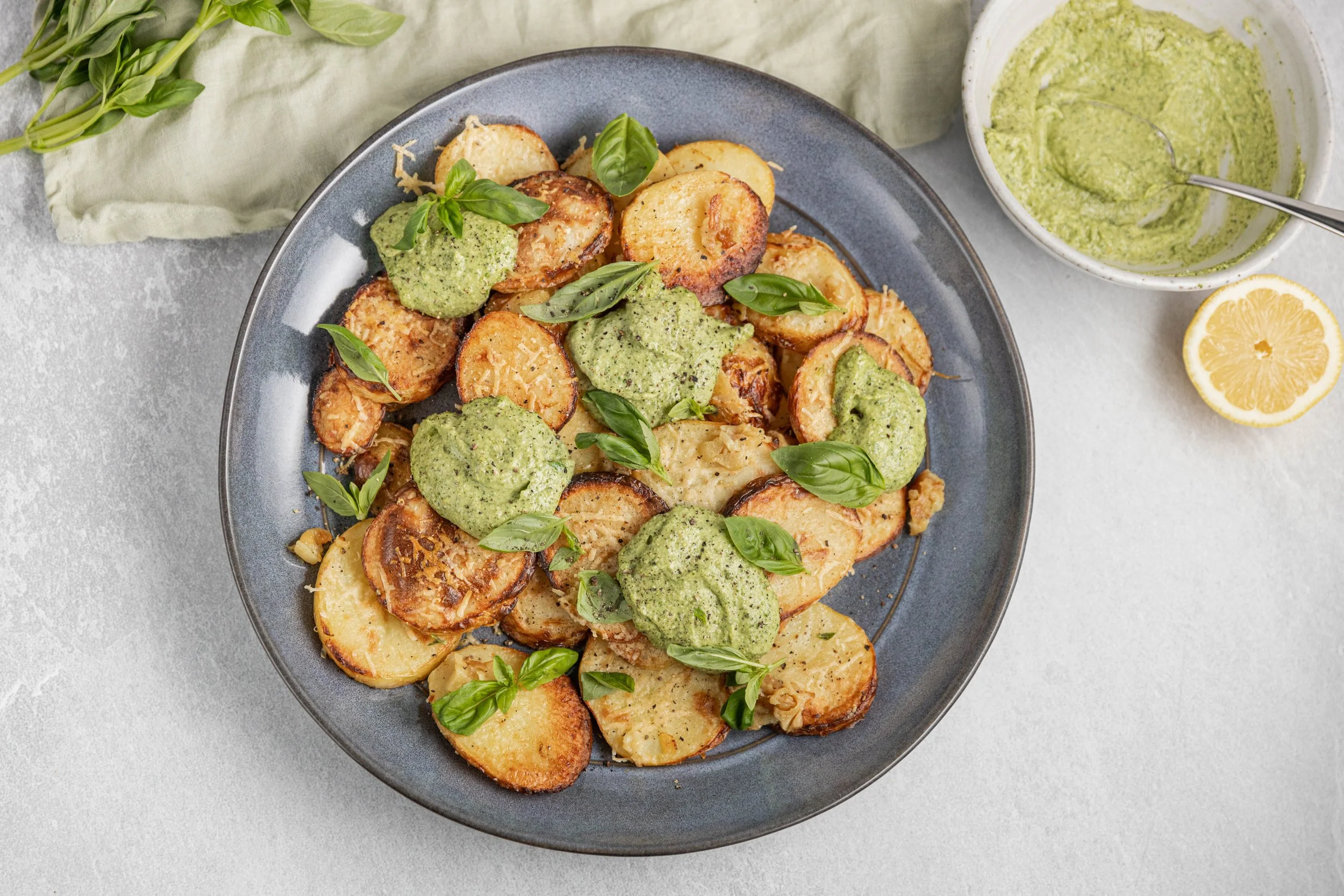 When the potatoes are ready, transfer to a serving bowl or plate and dollop with ricotta pesto. Garnish with fresh basil leaves, give it a good grind of black pepper and serve.
