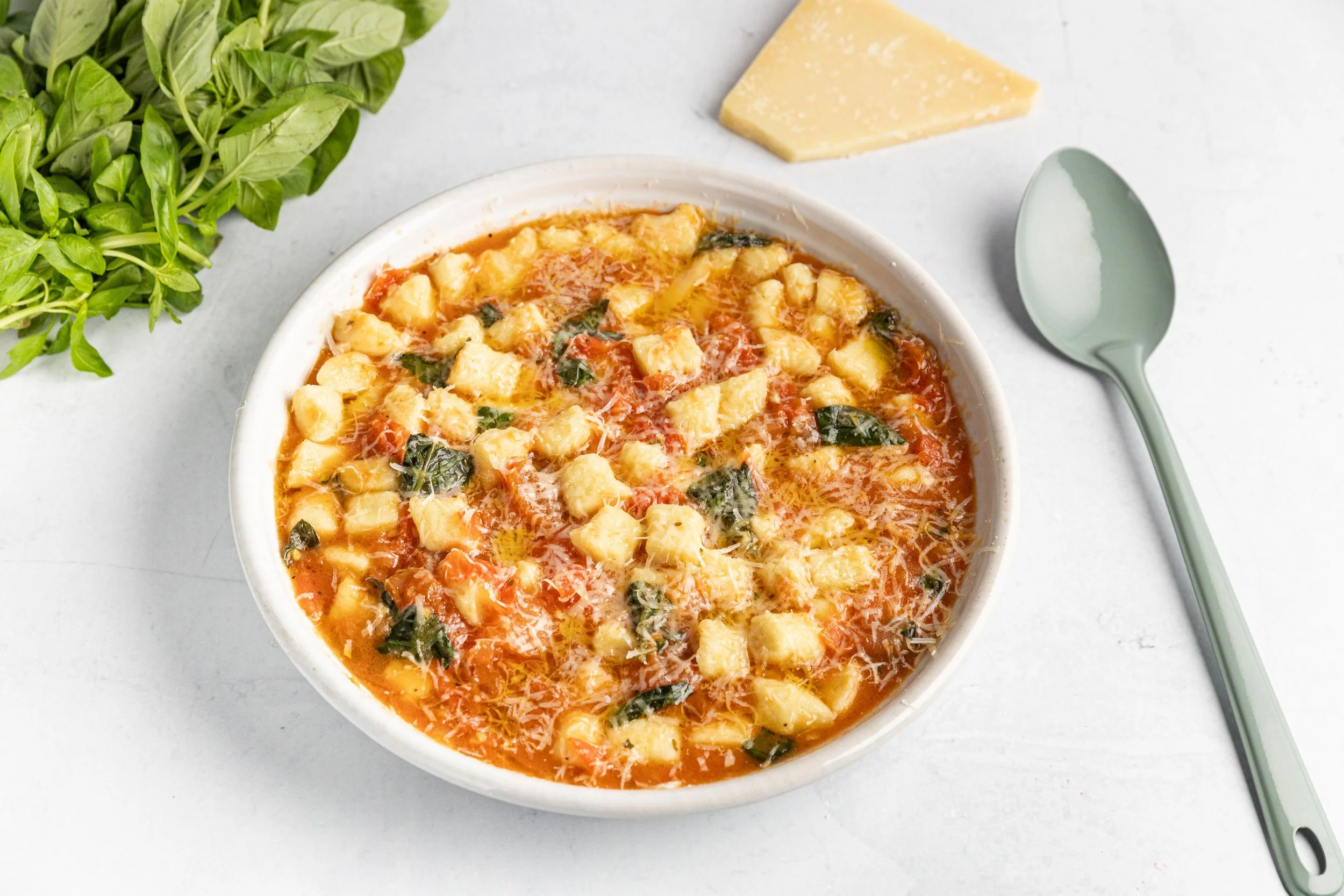 Cook the gnocchi until they float to the surface, drain, reserving 1 cup of the pasta water. Return the gnocchi to the pan with the tomato sauce and ¼-½ cup reserved pasta water to coat the gnocchi and tomato sauce. Cook on low for 1-2 minutes, tossing gently. Divide between bowls, top with grated parmesan, torn basil leaves and a big grind of black pepper.