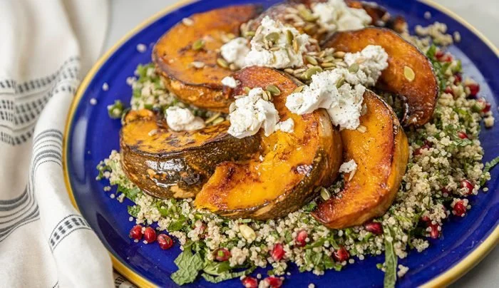 Add the herbs, cooled quinoa, pomegranate seeds, red wine vinegar and remaining olive oil to a large bowl. Gently toss to combine. Pour onto a large serving platter. Top with roast pumpkin wedges, goat cheese and the toasted seeds. Drizzle with a little more olive oil to serve.