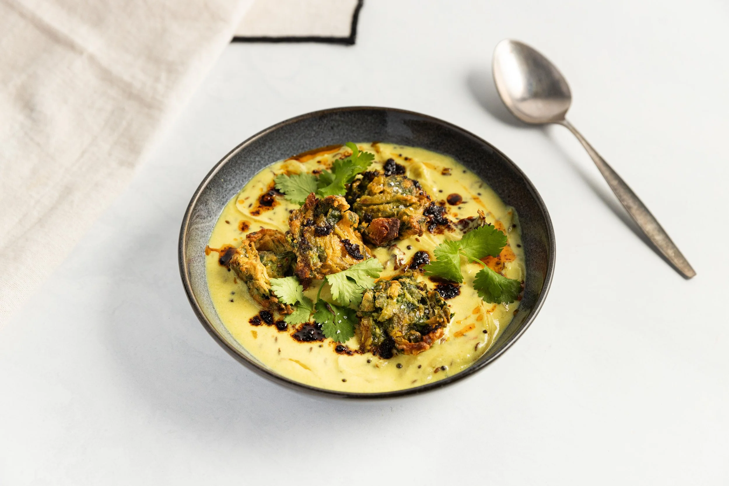 To serve, ladle the kadhi into bowls and place the pakora on top. Drizzle with chilli oil and finish with fresh coriander.