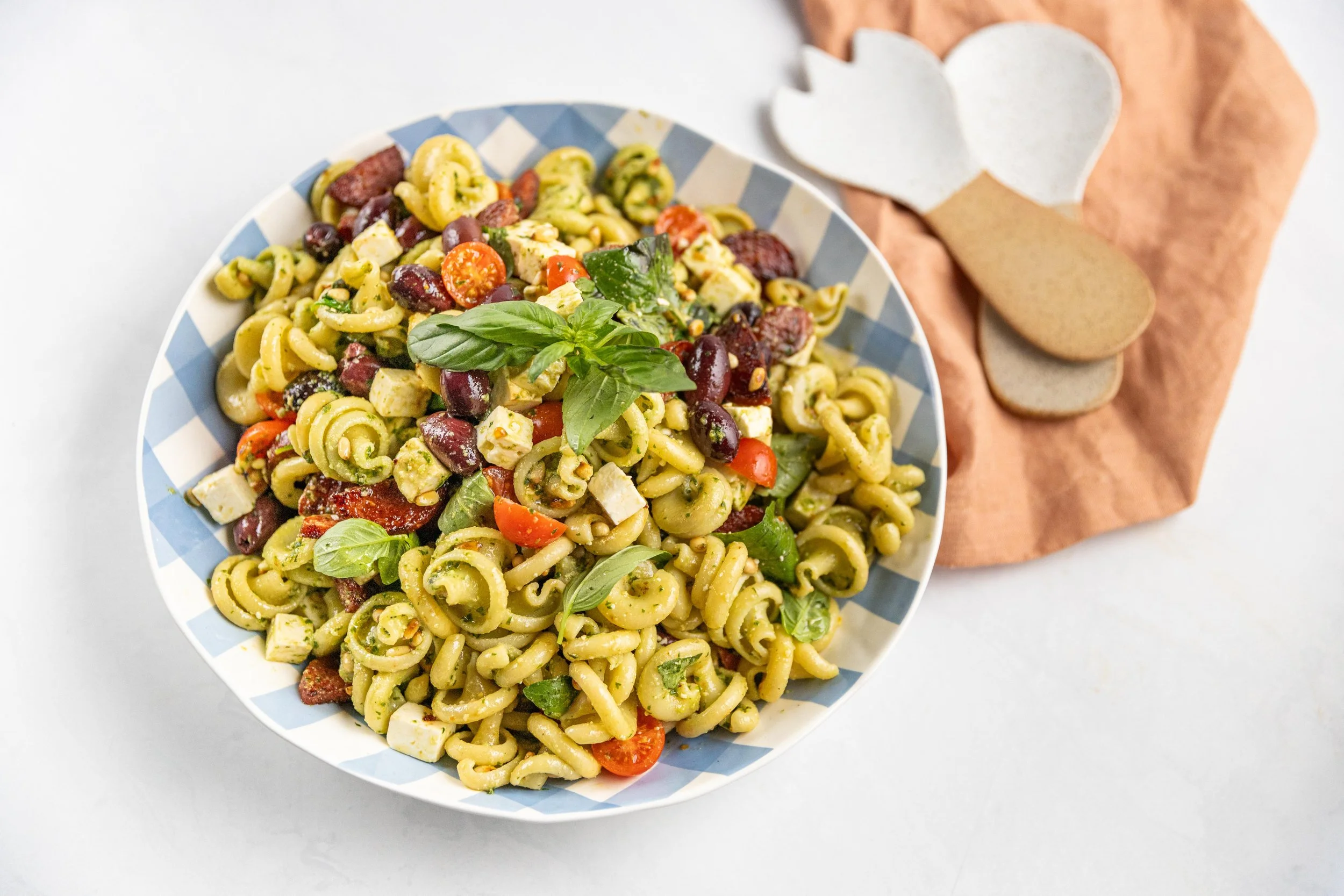 Cook pasta in salted boiling water as per packet instructions. Drain and place in a large bowl. Combine the olive oil and pesto in a separate bowl and add half to the warm pasta, tossing to combine. Leave the pasta for 30 minutes to come to room temperature.