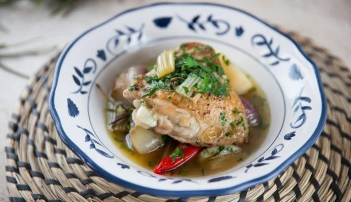 Add garlic, onions, fennel seeds, rosemary and bay leaves to the pan and cook for a few minutes. Add chicken stock, white wine, lemon rind, salt and pepper. Submerge the potatoes but try to keep the chicken skin above the liquid to keep it crispy.