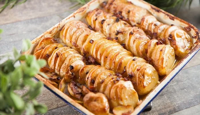 Arrange the sliced potatoes in rows on top of the onions. Add bacon and butter to the potatoes. Pour the stock over, it should come about ¾ of the way up the dish, add a little more water if needed.